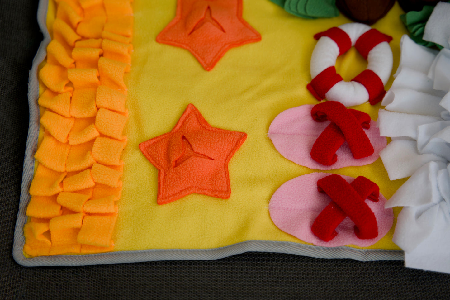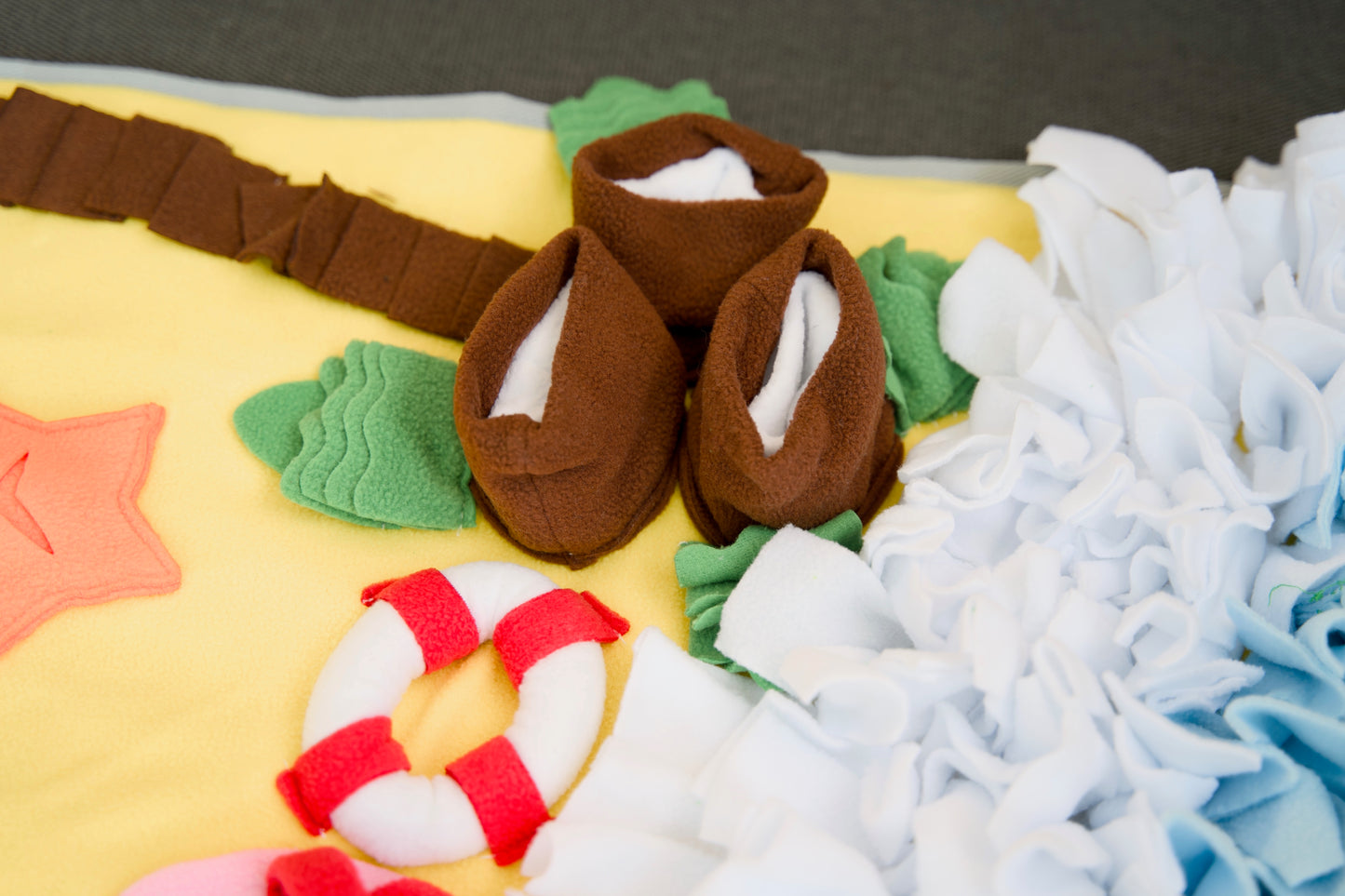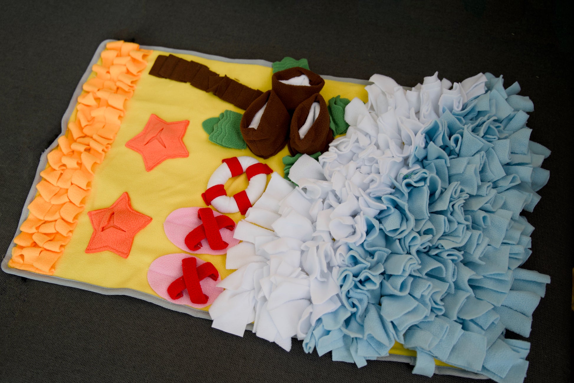 Apportez la plage à la maison avec ce tapis de fouille pour chien au thème estival, une façon amusante et interactive de stimuler les instincts naturels de votre compagnon. Conçu pour ressembler à un littoral, avec du molleton doux couleur sable et des zones bleues rappelant l’eau, ce tapis transforme les repas et les friandises en un jeu de recherche mentalement enrichissant.
